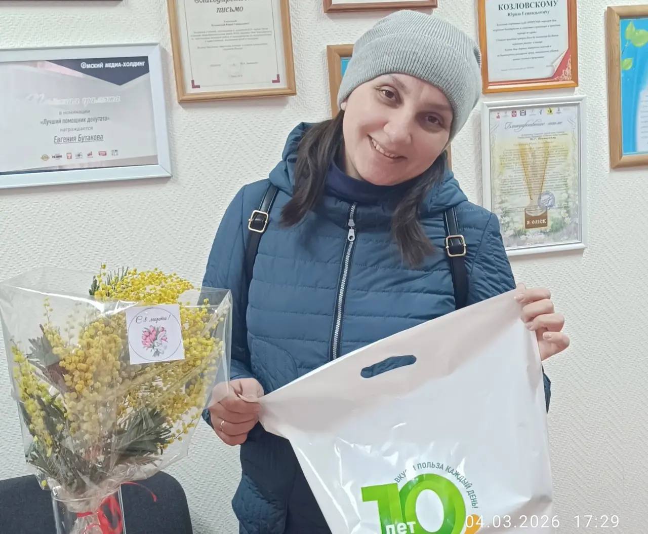 Так, депутат Юрий Козловский поздравил семьдесят омичек с наступающим праздником, вручив им продуктовые наборы.