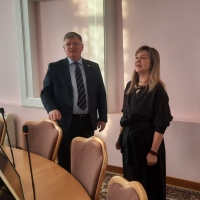 Сегодня Владимир Корбут передал Татьяне Терехиной собранный для праздника реквизит и провел экскурсию по 127-летнему зданию горсовета. Он рассказал об истории городской думы и работе депутатов.