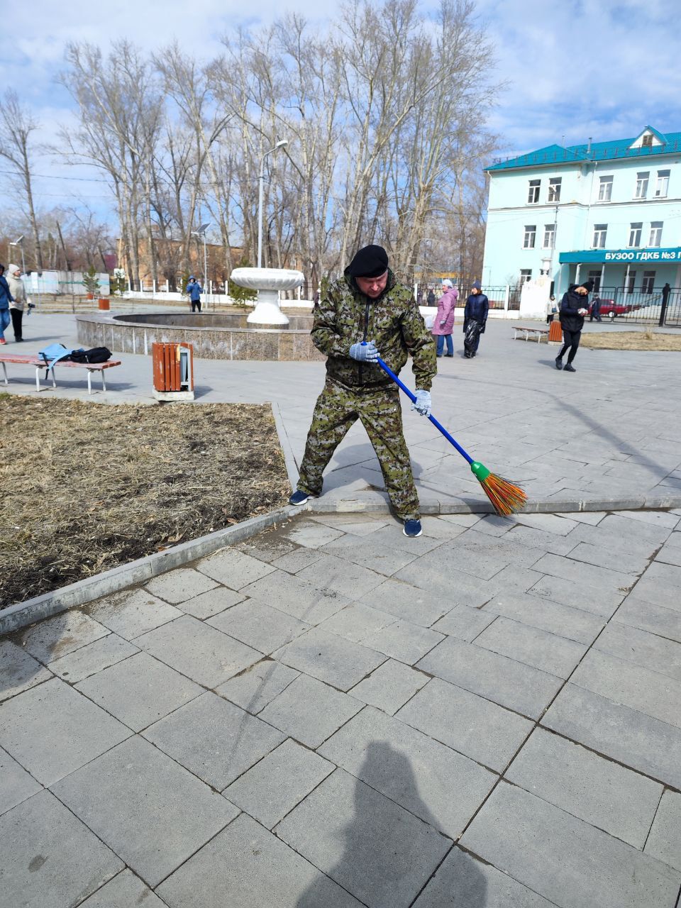 Вместе с активистами КТОС «Нефтяник» и студентами Омского монтажного техникума депутат привел в порядок территорию возле фонтана рядом с детской городской клинической больницей №3. После, с активистами КТОС «Энтузиастов» отчистил от мусора и прошлогодней листвы одноименный сквер. Третья точка - придомовые территории.