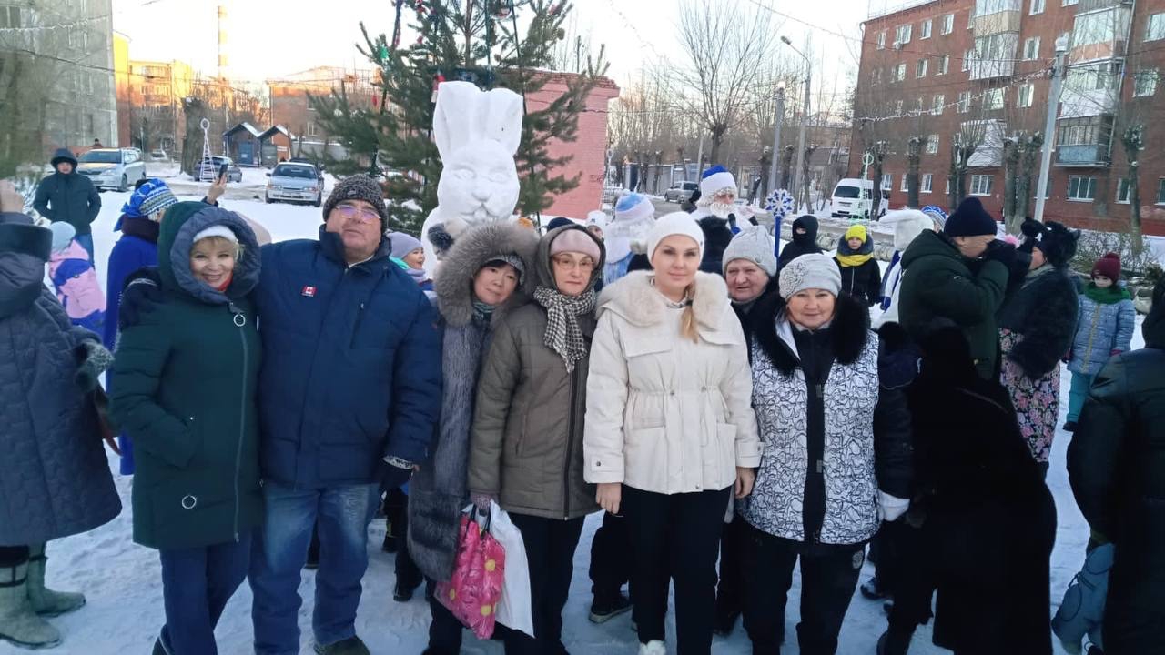 Оформить пространство помогла местная УК. Силами работников обслуживающей организации здесь появились огромные снежные фигуры Деда Мороза и Снегурочки, а также символа года – кролик. Местные жители нарядили елку и украсили территорию.