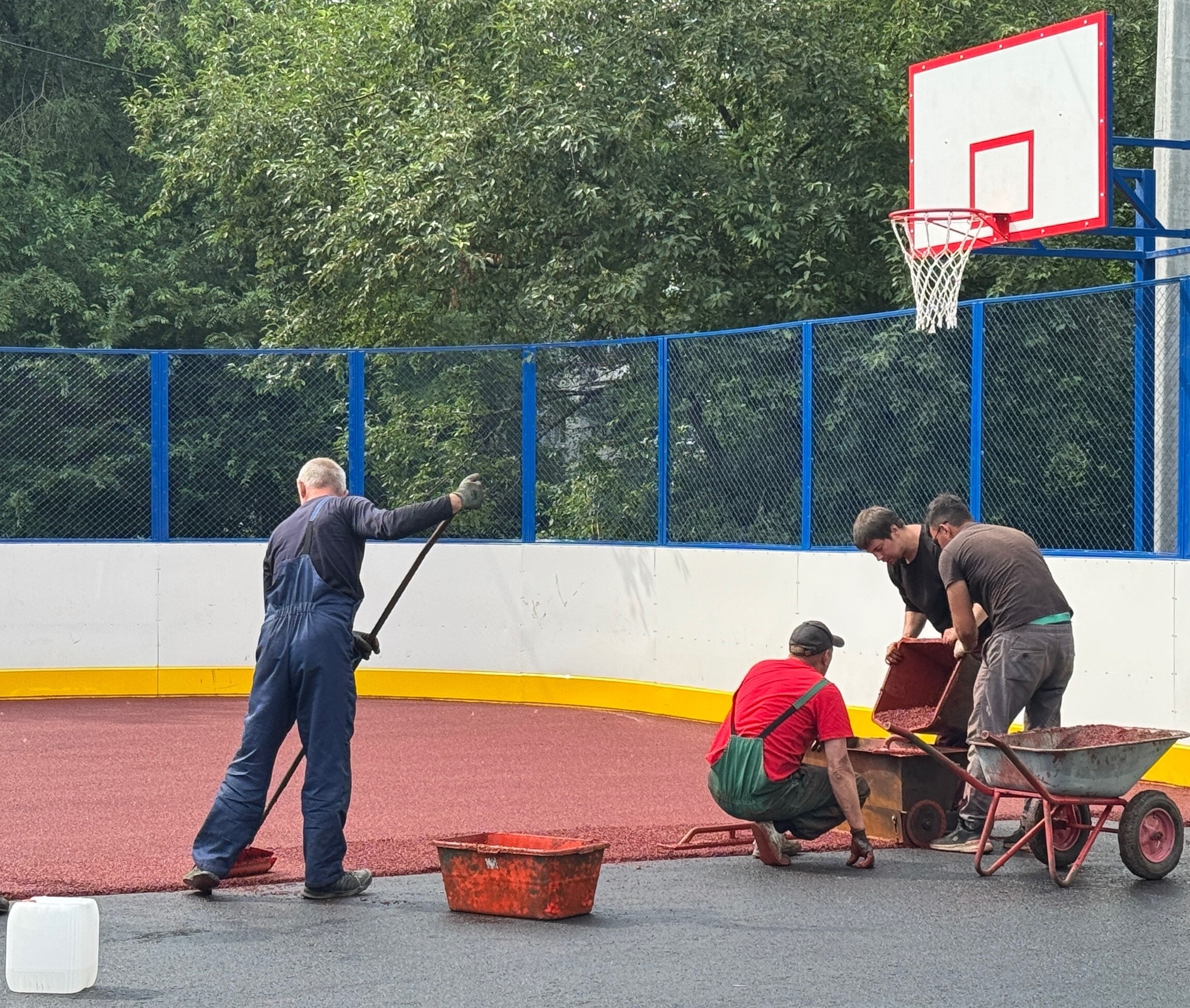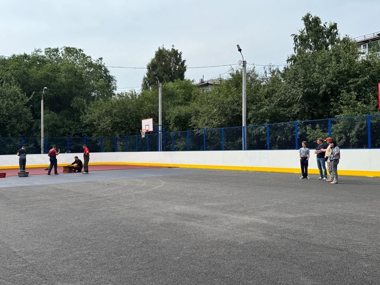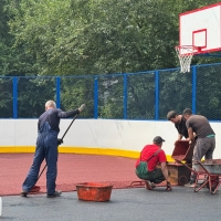 На многофункциональной площадке подрядчики приступили к укладке резинового покрытия, на котором тренироваться и играть станет комфортнее. Впереди торжественное открытие.