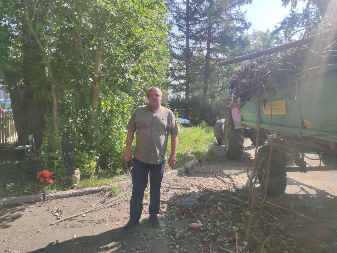 Во дворе школы тоже кипит работа: здесь убирают аварийные деревья и кронируют старые. Содействие в этом оказывает депутат Алексей Русавский.