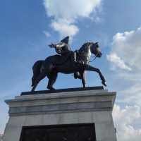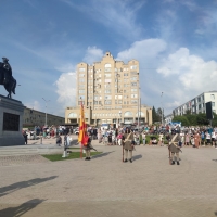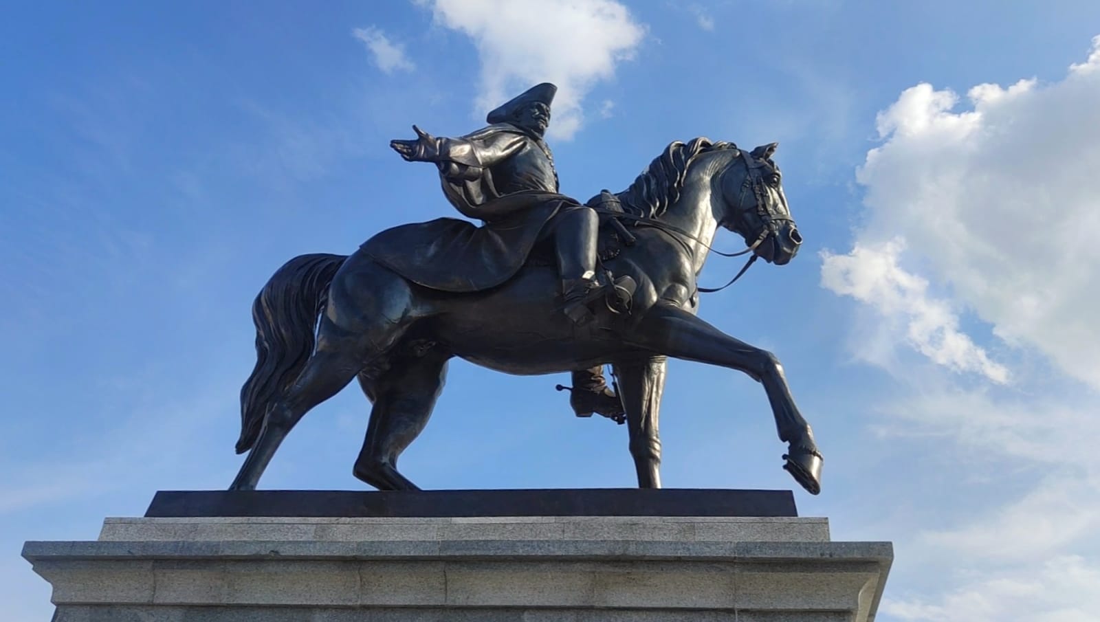 Это первый конный памятник в нашем городе. Он установлен на Иртышской набережной, обращен к реке и стал подарком горожанам ко Дню города. В торжественном открытии приняли участие руководитель региона Виталий Хоценко, мэр Омска Сергей Шелест и председатель Омского городского Совета Владимир Корбут, а также руководители и инициаторы проекта – Акционерное общество «Группа компаний «Титан» Михаил Сутягинский и скульптор Михаил Минин.
