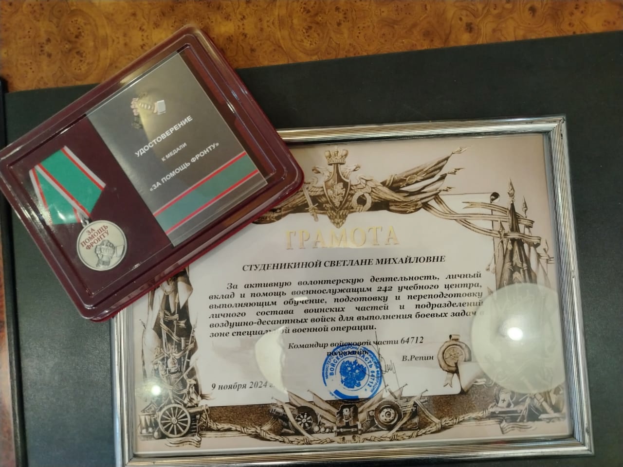 В преддверии Дня добровольца (волонтёра) председатель Законодательного Собрания Омской области Александр Артёмов вручил заместителю председателя Омского городского Совета Светлане Студеникиной медаль «За помощь фронту» и Грамоту за помощь военнослужащим 242 учебного центра ВДВ.