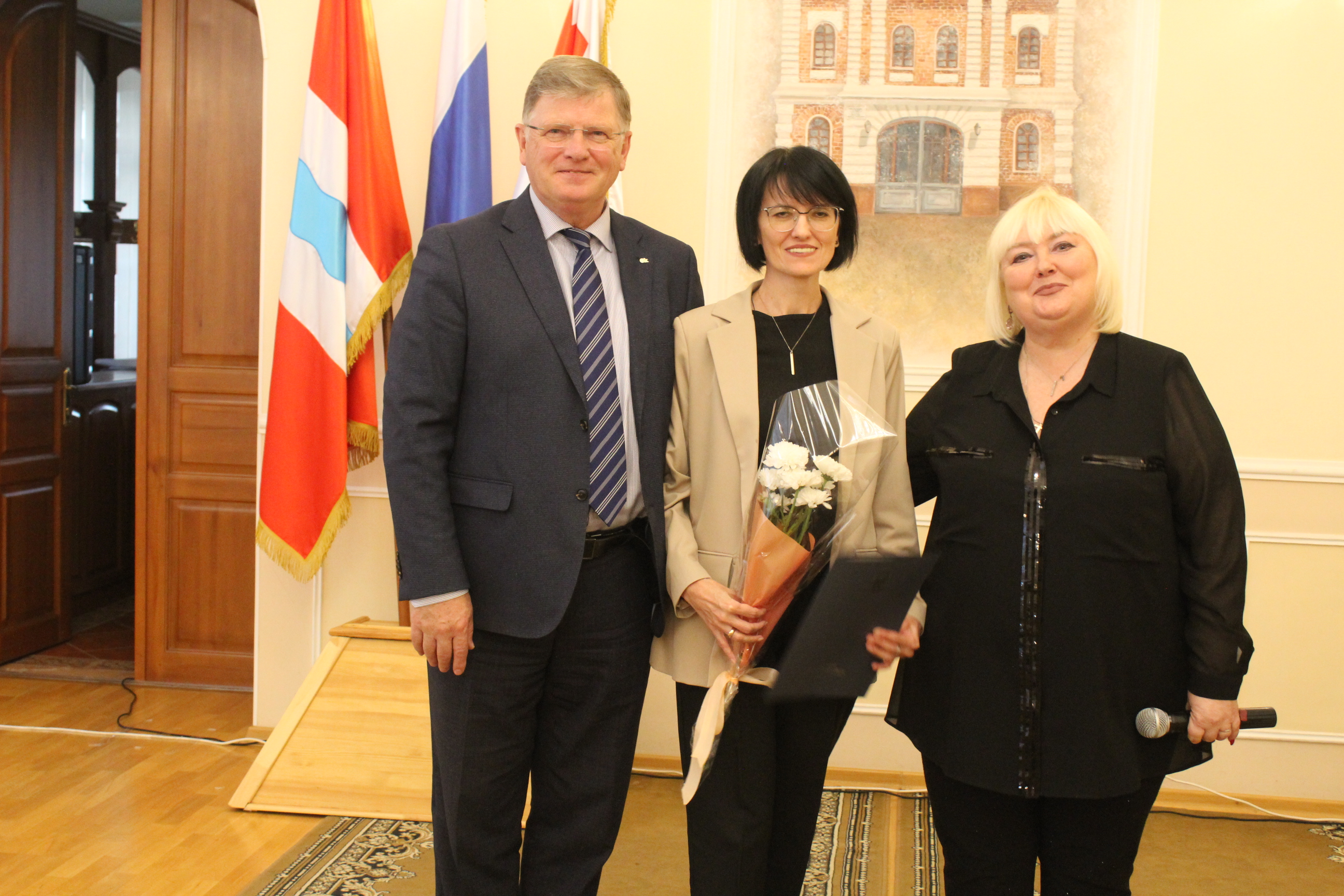 Председатель Омского городского Совета Владимир Корбут обратился к педагогам с приветственной речью, и вместе со Светланой Студеникиной они вручили учителям благодарственные письма.