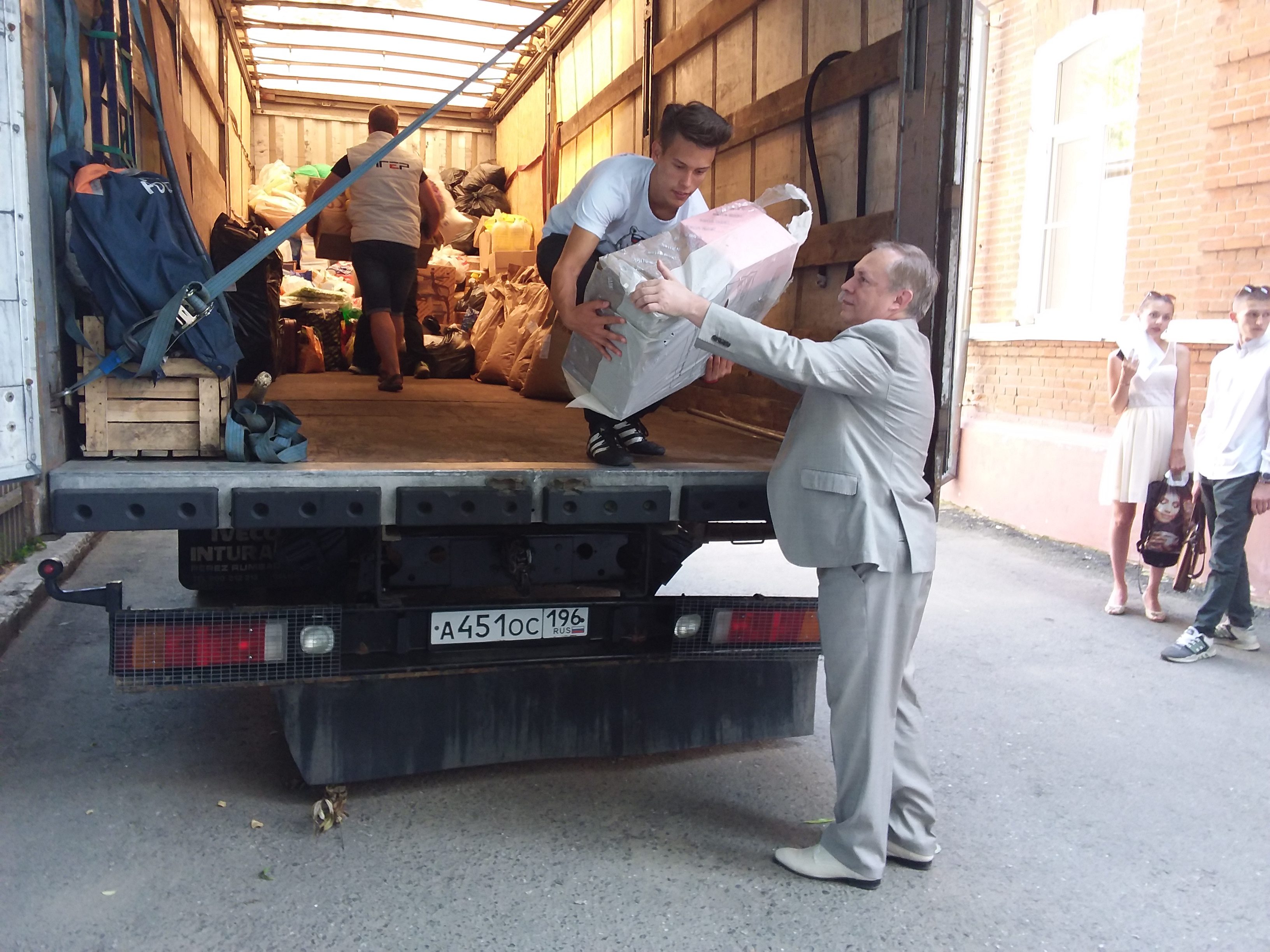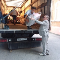 Первый вице-спикер горсовета Омска Юрий Тетянников лично принял участие в формировании груза, помогая таскать ящики с продовольствием и вещами.