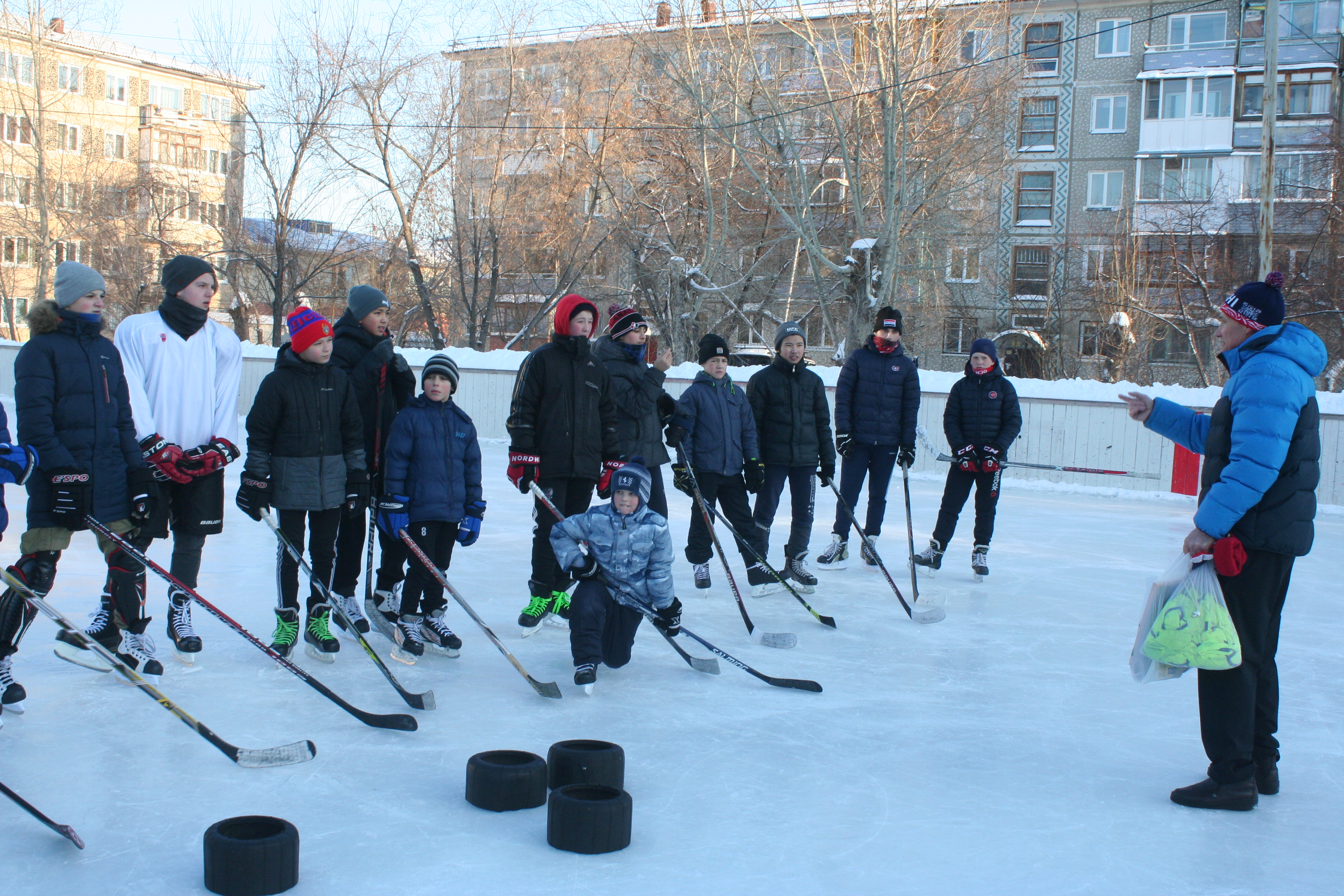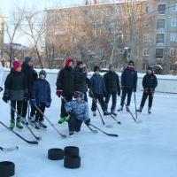 Ровно к назначенному времени на гладкий лед выкатились юные хоккеисты во главе со своим тренером Владимиром Михайловым. Это благодаря его неустанной заботе лед здесь всегда в хорошем состоянии, а местная детвора с удовольствием занимается хоккеем.