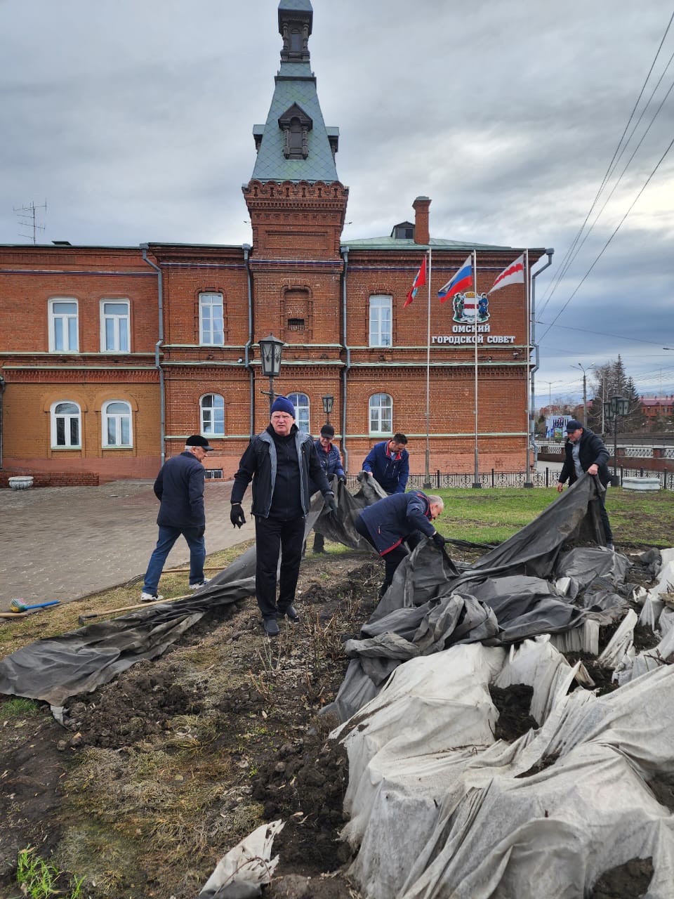 Сотрудники Омского городского Совета под руководством председателя Владимира Корбута убирают территорию возле исторического здания.