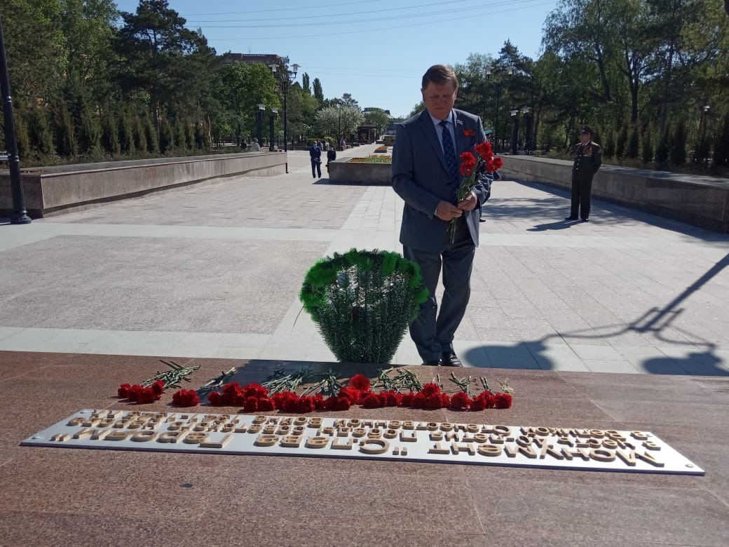 Председатель Омского городского Совета Владимир Корбут посетил обновленный бульвар Победы, где возложил цветы к монументу «Слава Героям».