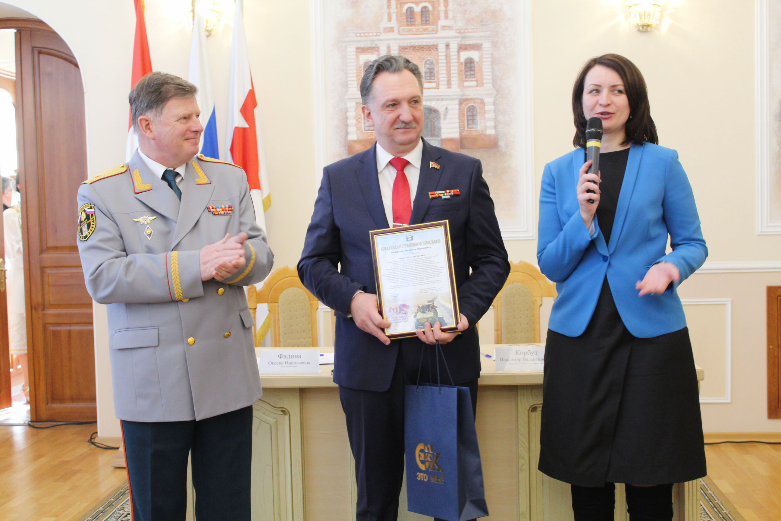 В зале торжеств собрались представители общественных объединений участников боевых действий в Афганистане, ветеранов войны и военной службы, пенсионеров, родителей, семей погибших при исполнении воинского долга, органов внутренних дел и внутренних войск России. Со словами приветствия к собравшимся обратился председатель Горсовета Владимир Корбут.