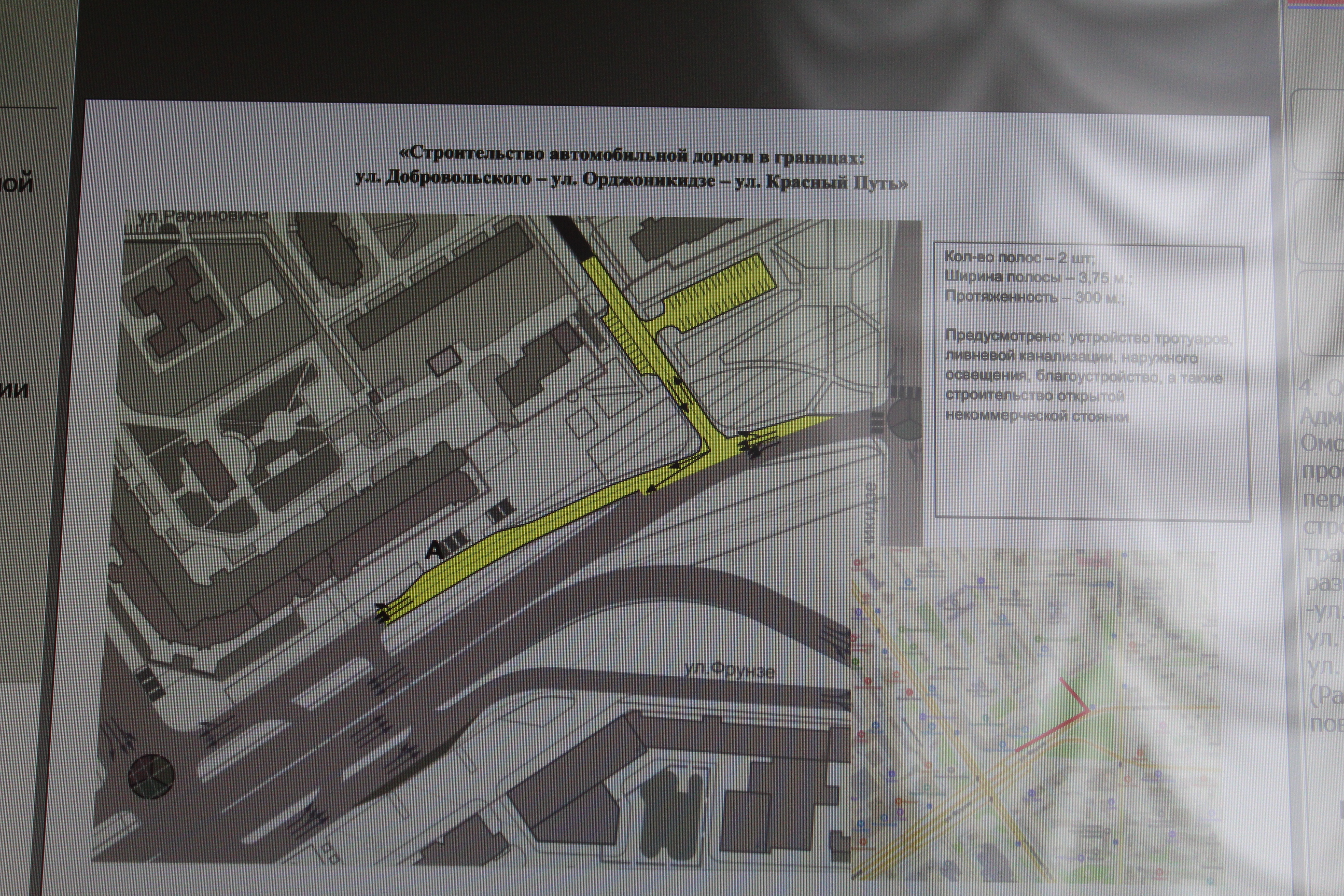 Предварительно запланировано удлинение бокового проезда ул. Фрунзе севернее эстакады и примыкание проезжей части ул. Добровольского к проезжей части ул. Фрунзе шириной две полосы движения транспорта общей протяженностью 300 м с устройством тротуаров, велодорожек, ливневой канализации, наружного освещения, а также озеленение и благоустройство прилегающей территории.