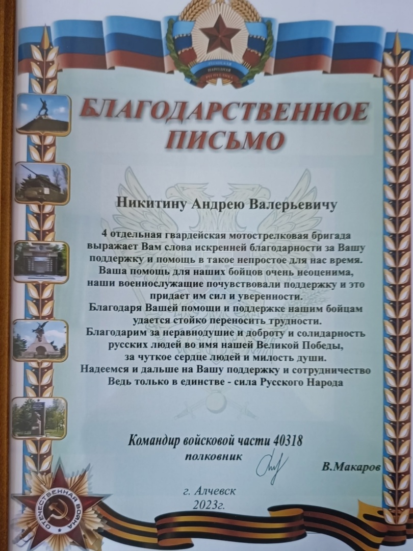 — Два месяца назад я рассказывал, что мы купили «Ниву» и отправили её в подшефный десантный полк 104 воздушно-десантной дивизии. И вот новое приобретение - машина УАЗ «Патриот» и гуманитарный груз отправлены нашим бойцам в распоряжение 4 отдельной гвардейской мотострелковой бригады в город Алчевск. Отправили четыре тепловизора, два квадрокоптера, два принтера для распечатки листовок. Спасибо всем, кто помог финансово, всем неравнодушным жителям, кто не жалеет сил и средств для отправки помощи бойцам, — сказал Андрей Никитин.