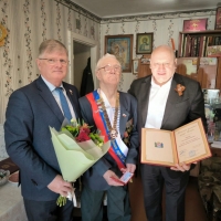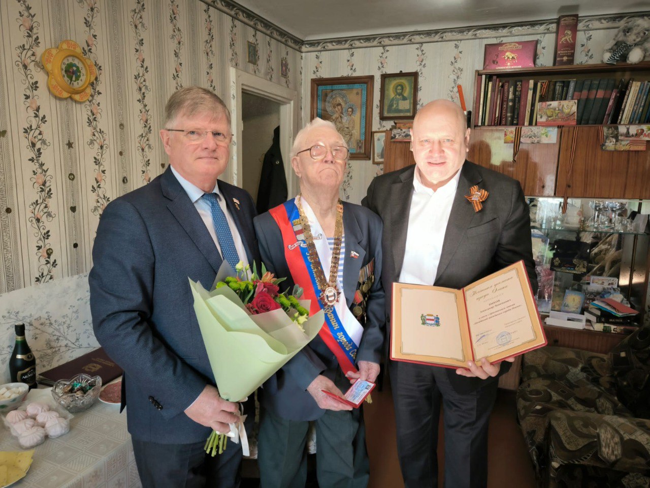 Председатель городского Совета Владимир Корбут и мэр Омска Сергей Шелест посетили ветерана Александра Леонтьевича Быкова, чтобы исполнить почетную миссию и поздравить его с праздником.